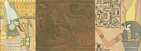 This carved wall panel from a Mayan temple in Central America is a Mayan version of the classical Egyptian Judgment Scene. They contain common elements. Hawk, serpent, and sun symbolism were common to Pagan religion of Isis genealogy everywhere.