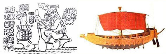 The image to the left is Itzamna arriving from the east paddling a canoe (c. 1200 BC). The image to the right is the galleon of Rameses III (c. 1175 BC). The Maya used canoes. They didn't have ships. Notice the row of "wings" along the side of the canoe that Itzamna is paddling. The Mayan artist who made this image had almost certainly never seen a ship. The artist was probably working from a verbal description of a "canoe" with rows of oars along the sides and sails that enabled it to "fly" before the wind.